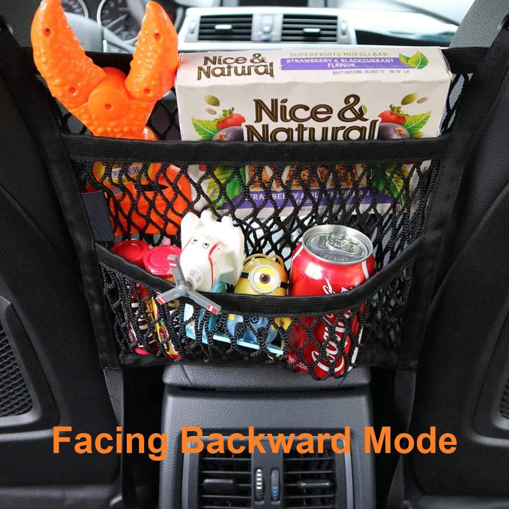 - Featuring three layers of storage, this organizer offers a variety of compartments to accommodate your belongings. The top layer is designed with a stretchable net, perfect for storing items such as purses, water bottles, or toys, allowing easy access while keeping them securely in place. The middle layer consists of multiple pockets, ideal for organizing smaller items like phones, sunglasses, snacks, and more. The bottom layer is a durable net barrier that helps prevent pets or kids from accessing the front seats while driving.