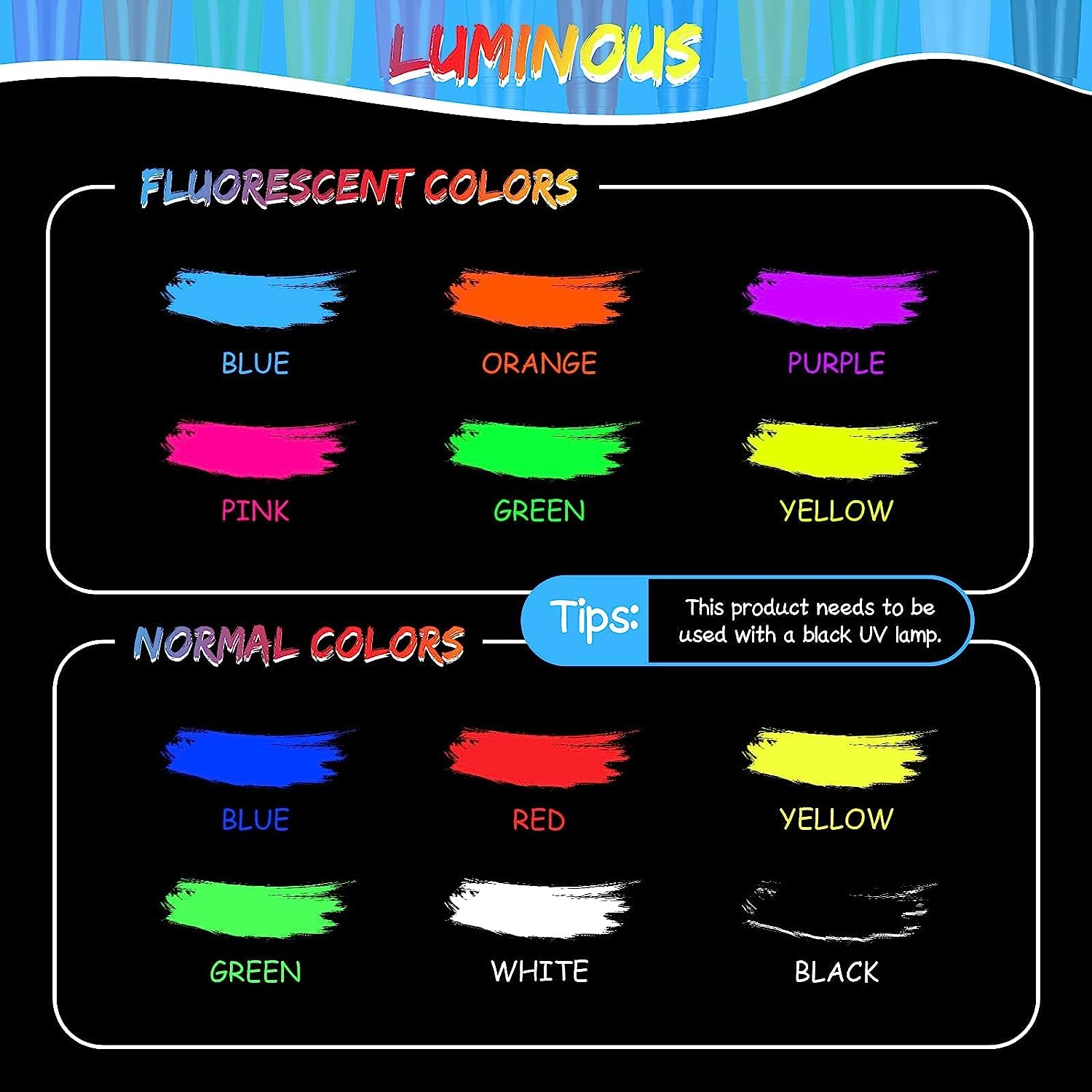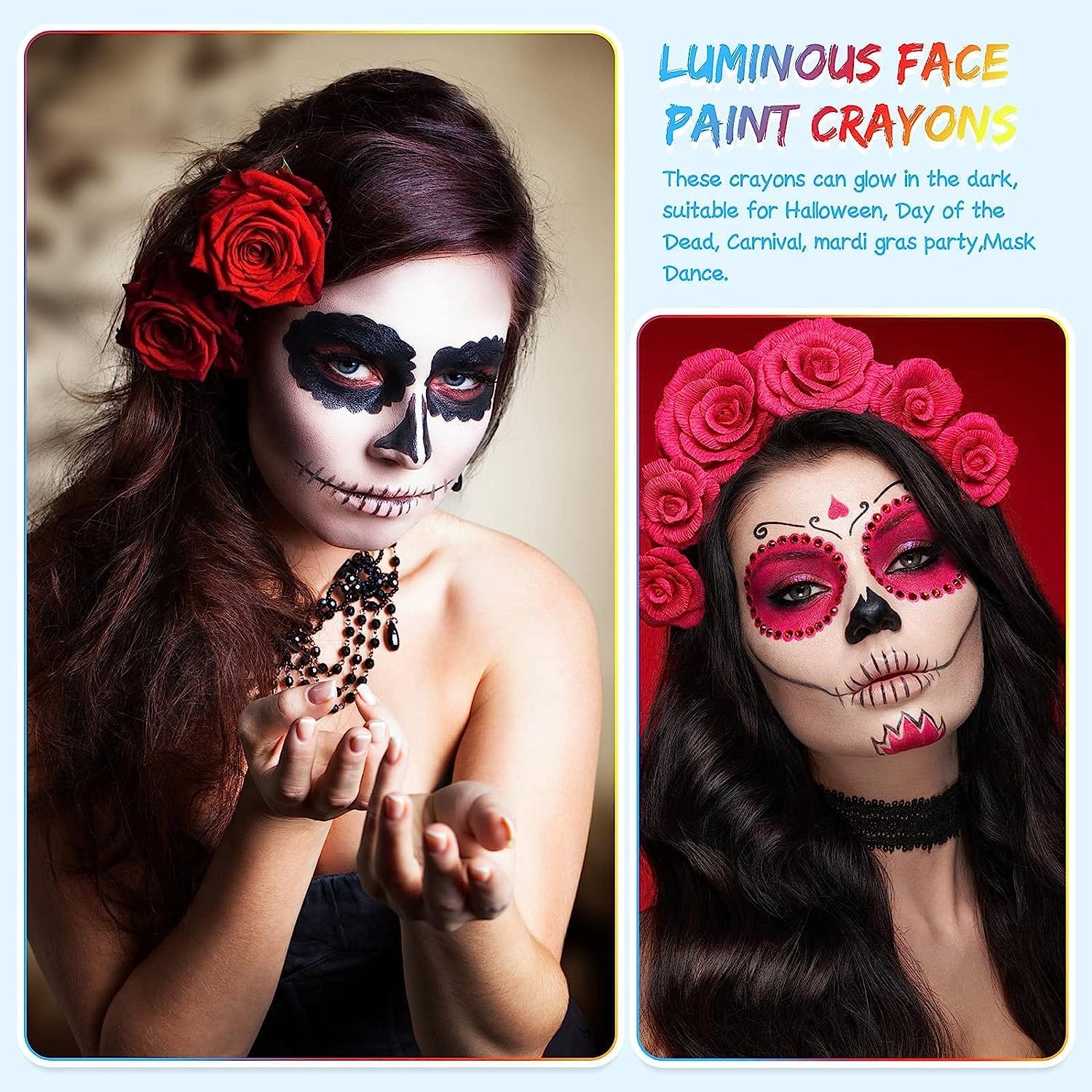• Facial painting crayons present bright neon colors under natural light, after we use these crayons for face and body painting, the makeup glows spectacularly under UV lighting or blacklights producing an UV glow; Note that only 6 of the fluorescent colors glow