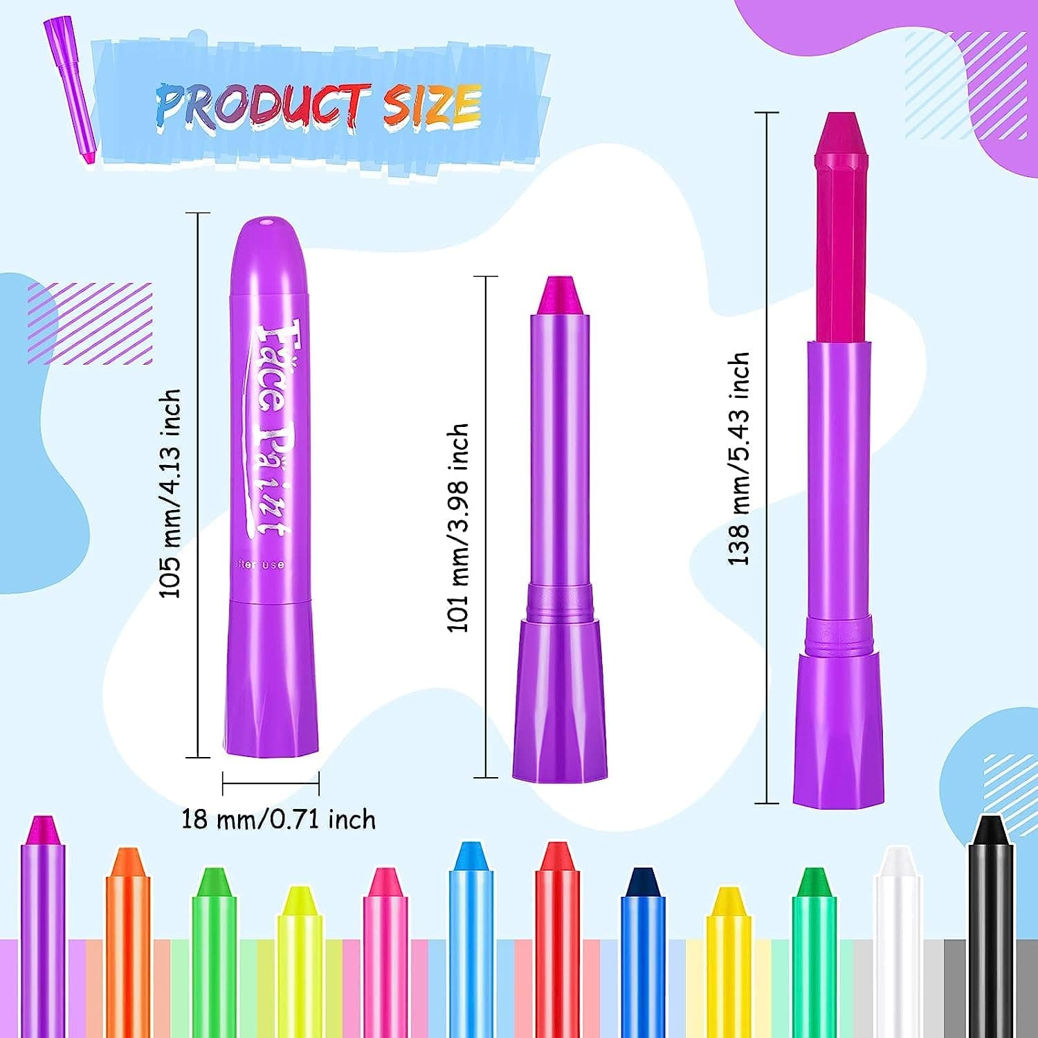 • You will get 12 different colors of face paint crayons, 6 pieces fluorescent colors and 6 pieces normal colors, each size is about 4 x 0.8 inches, 12 different colors are enough to meet your makeup needs
