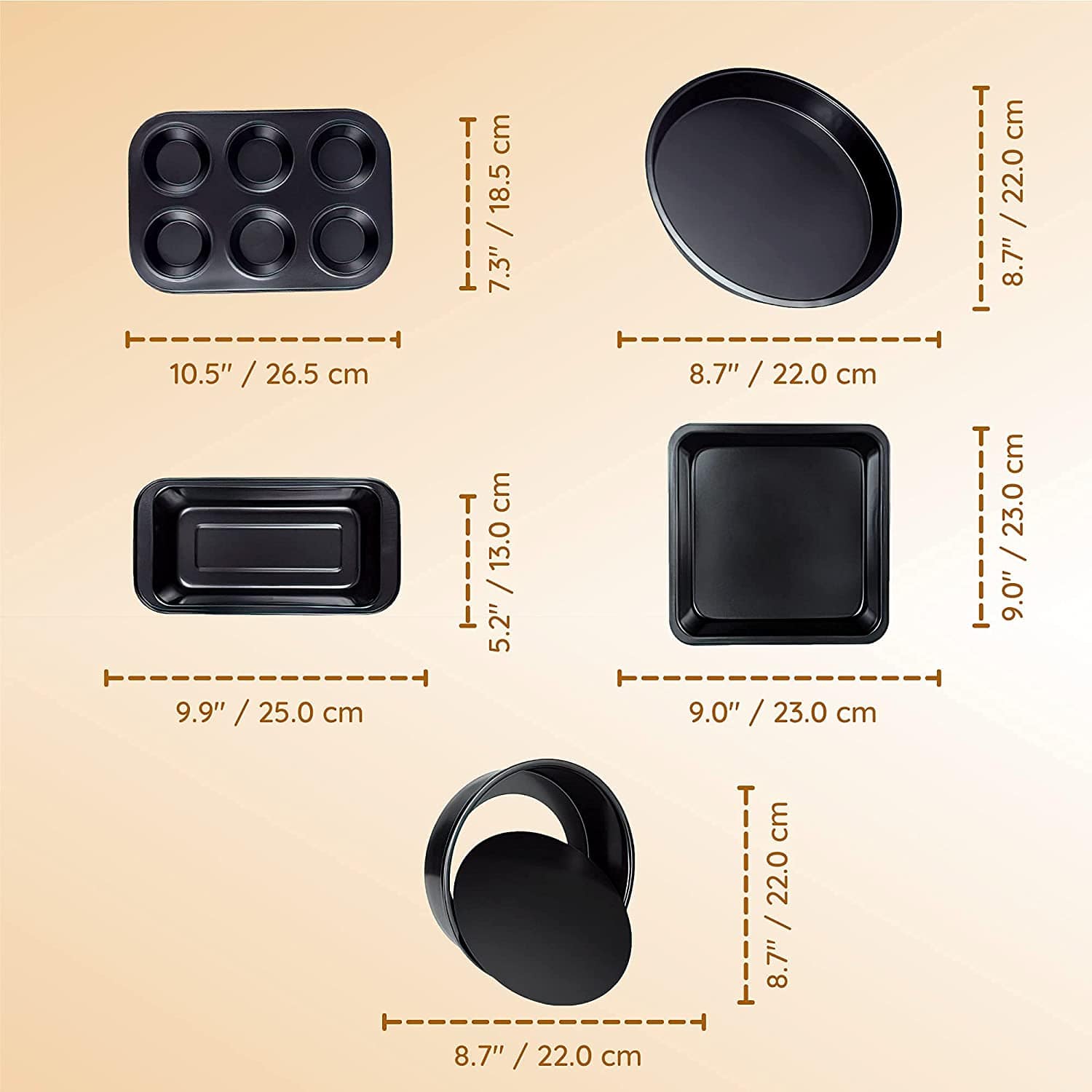 - The ultimate baking companion for home cooks and bakers alike. This 5-piece set includes a variety of non-stick bakeware pans made from food-grade carbon steel, perfect for creating cakes, toast, pizzas, and cookies. The set also comes with a silicone mit for safe handling of hot bakeware.