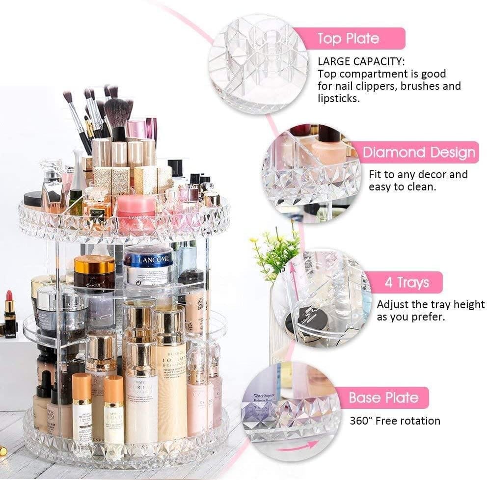 • Made of high-quality materials, this makeup organizer is built to last and can easily hold all of your beauty essentials without taking up too much space. Whether you're a makeup enthusiast or simply looking for a way to keep your cosmetics organized, the 360 Degree Rotating Makeup Organizer is the perfect solution for you.