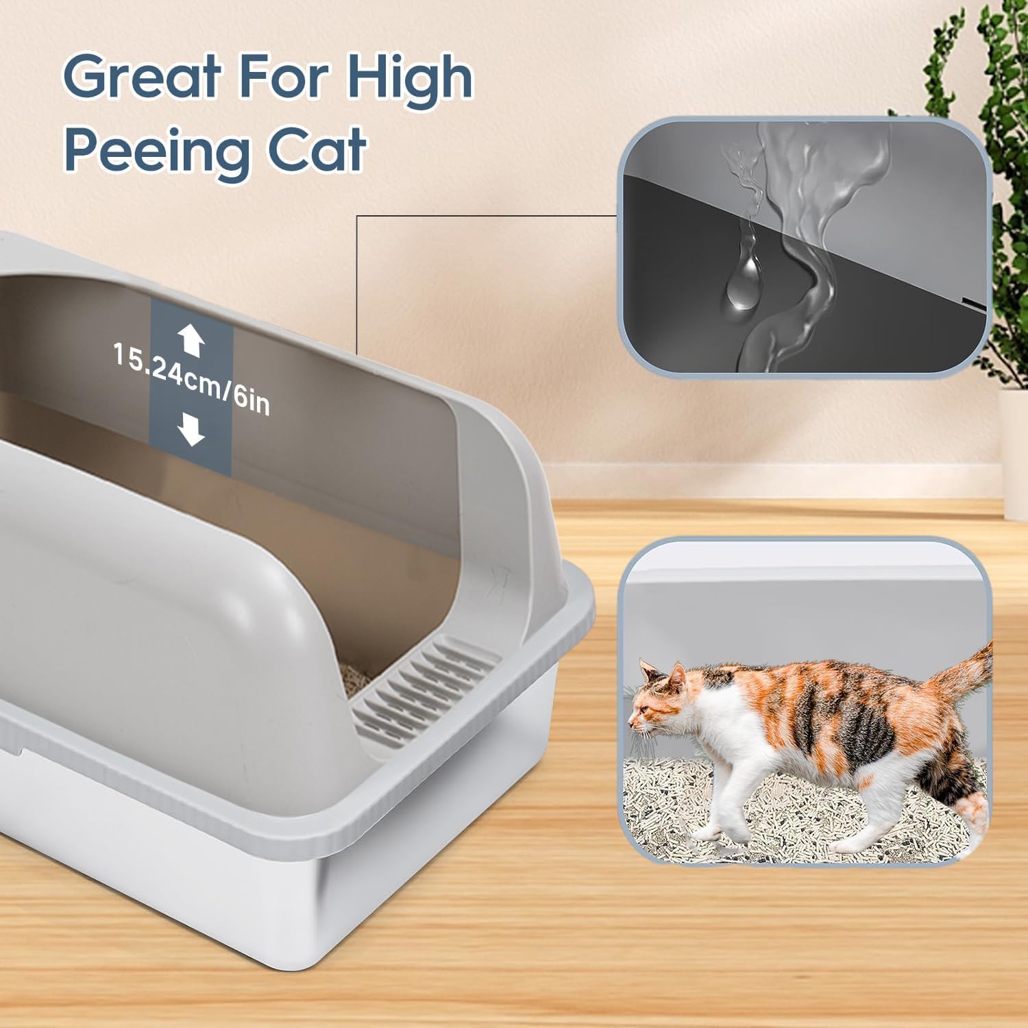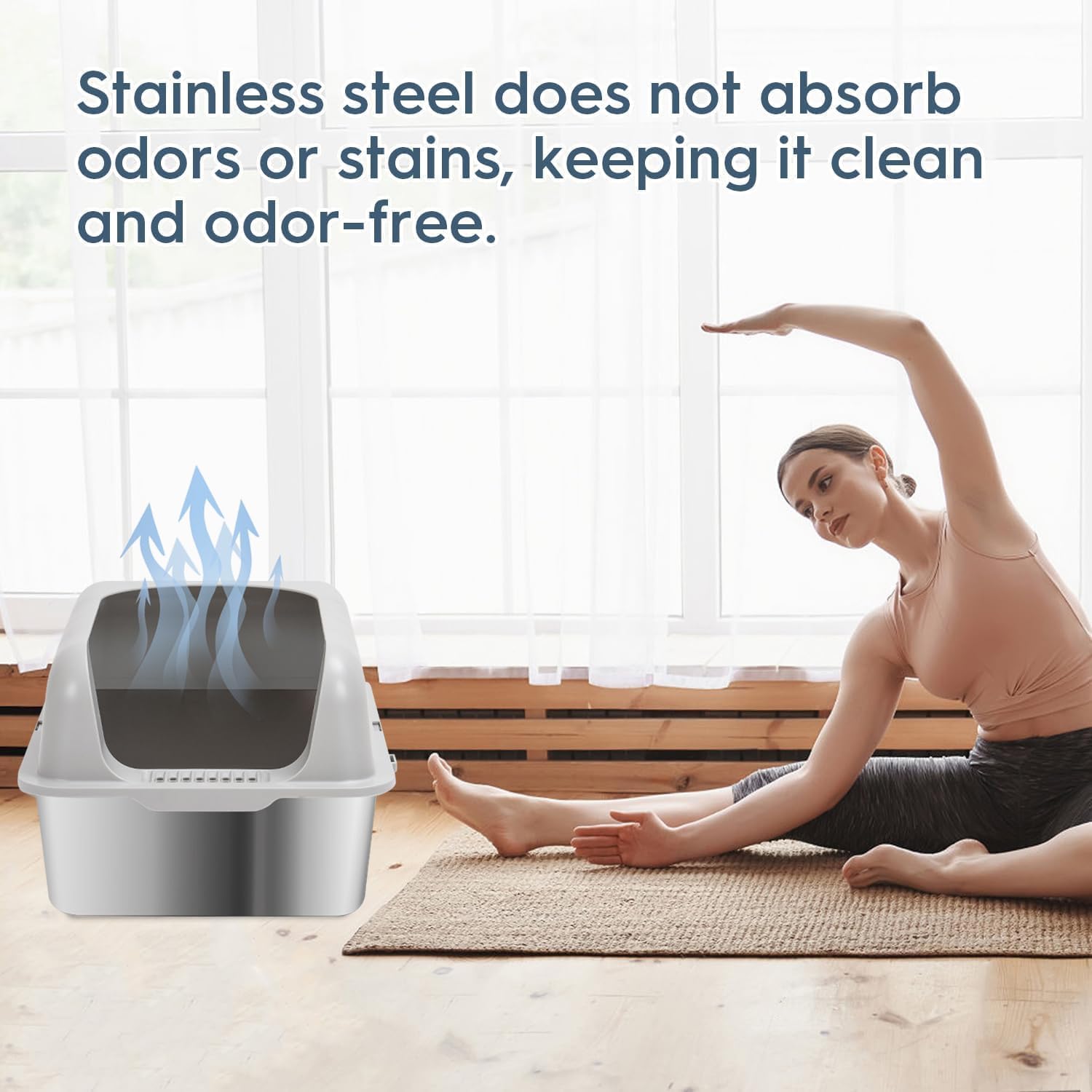 - Stainless Steel Litter Box - Cleaning the litter box is very easy as waste slides off the smooth surface effortlessly, leaving no lingering odors behind. The metal litter box offers outstanding durability, resisting even the most determined scratching or biting from your pet. The bottom of the litter box is equipped with a silicone anti-slip pad, providing stability, quietness, and protection against floor damage.