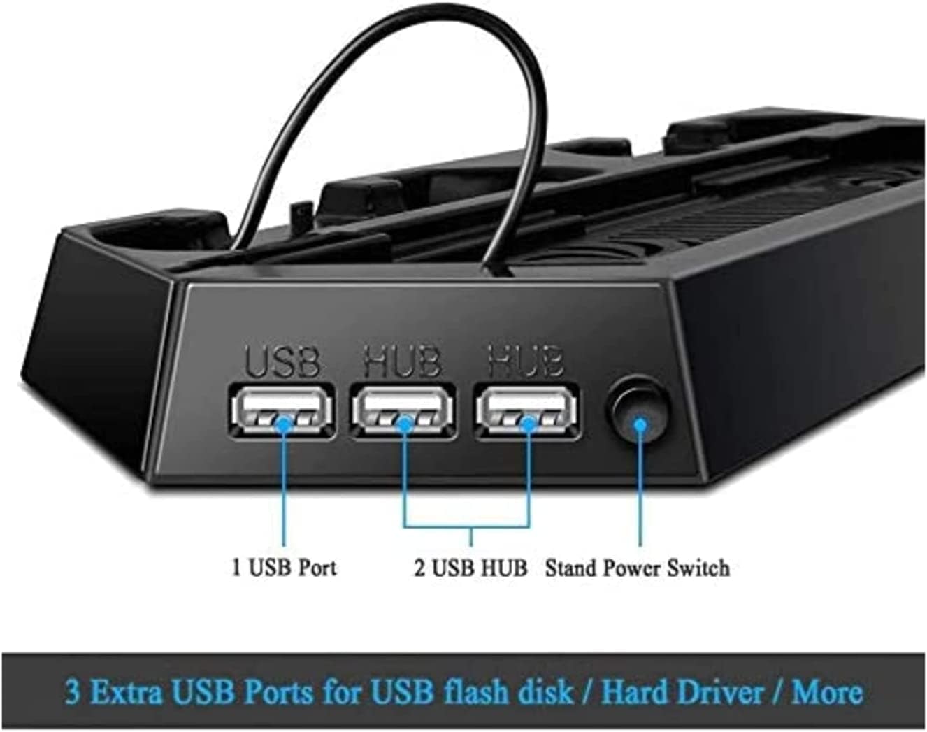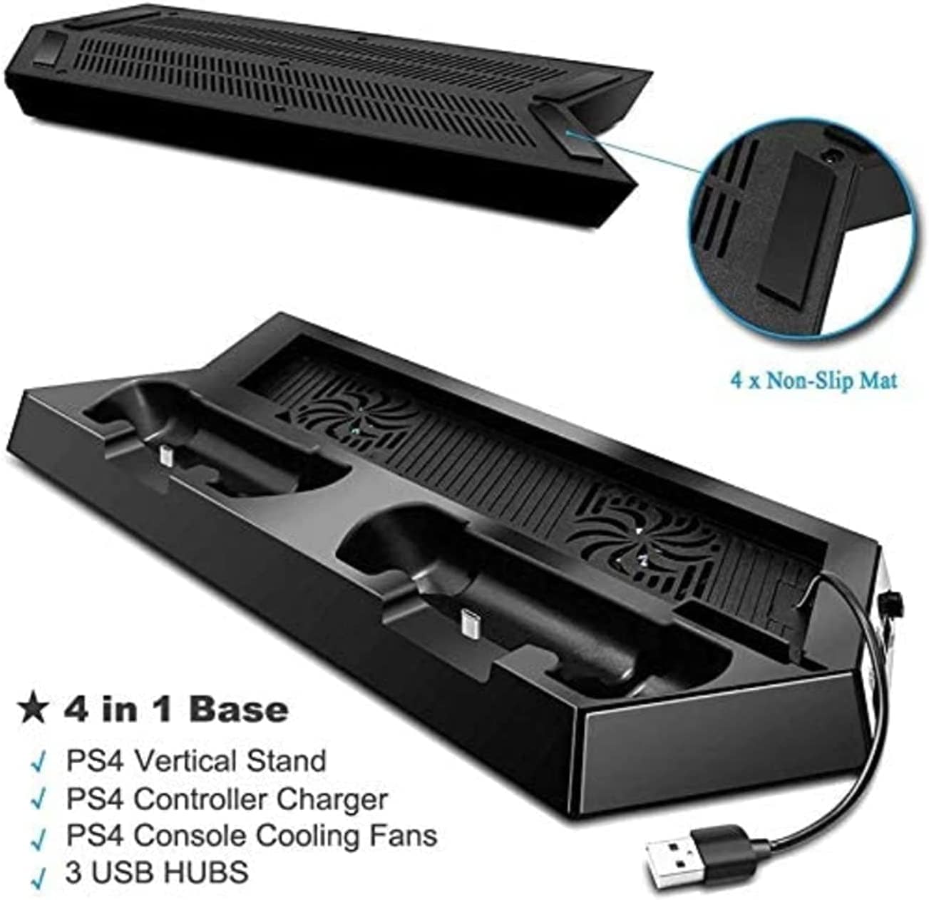 - All in one for PS4 console vertical stand + two cooling fans + 2 controller charging docks + three additional hub ports