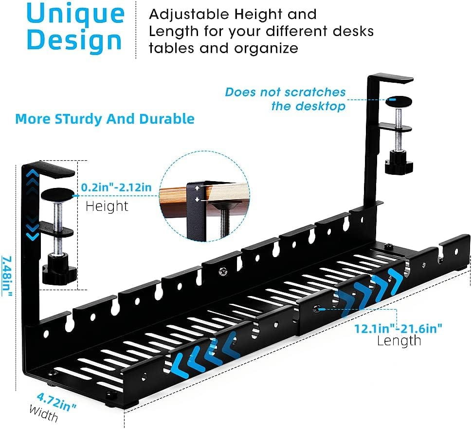 - 2 in 1 design can expand the length of the tray from 12.1 in" to 21.6 in". And the height of the fixing clip is 0.2in" to 2.12in", which is more flexible than the traditional cable raceway. There has enough space to adapt to different desks and demands. You can also decide whether to use it in two parts according to