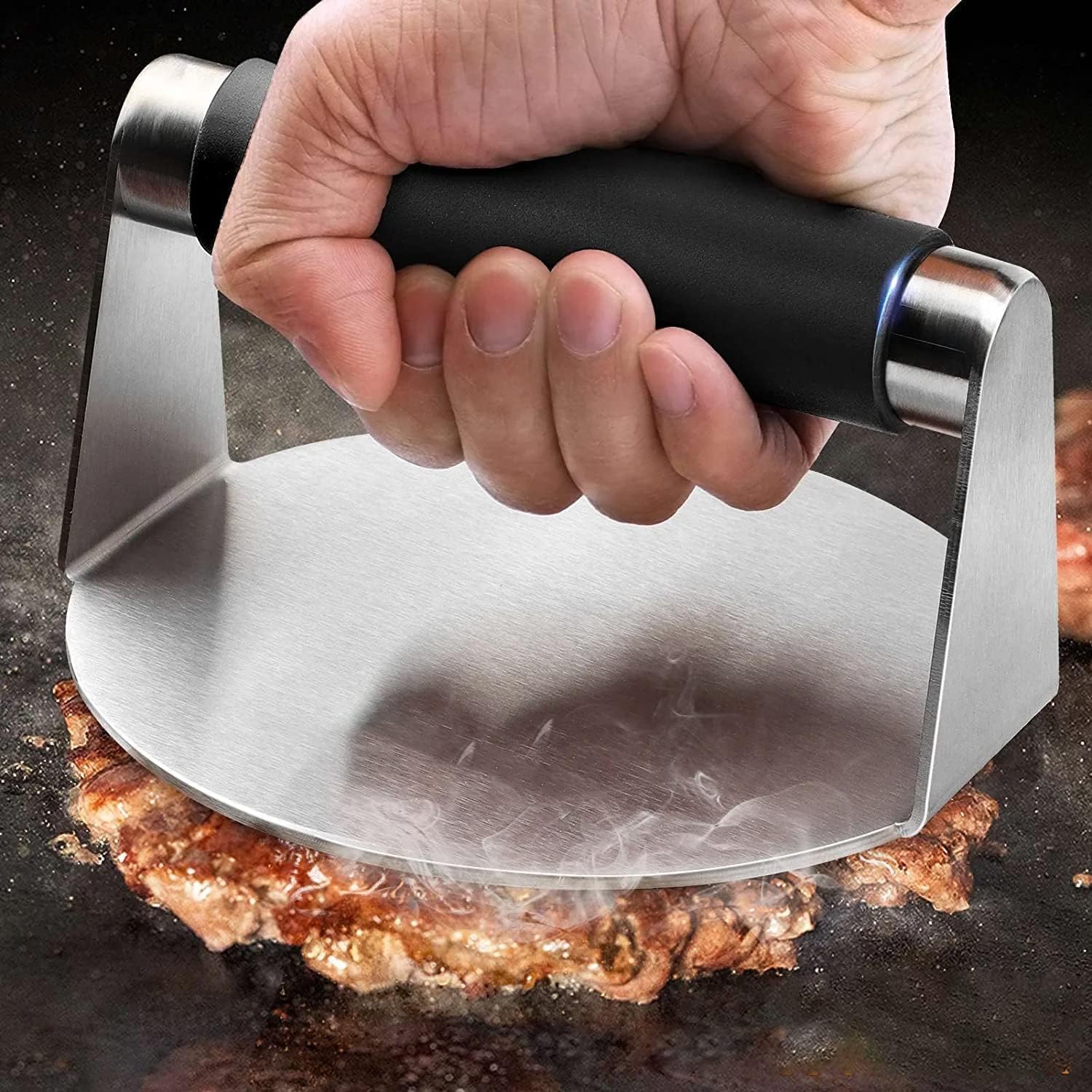 - 【Non-Stick and Smooth】Made of an upgraded version of 304 stainless steel material, the burger press is non-stick whatever food you cook. Put aside the worry of sticking problems. Moreover, With a smooth and flat bottom, the smash burger press can heat food evenly and cook faster