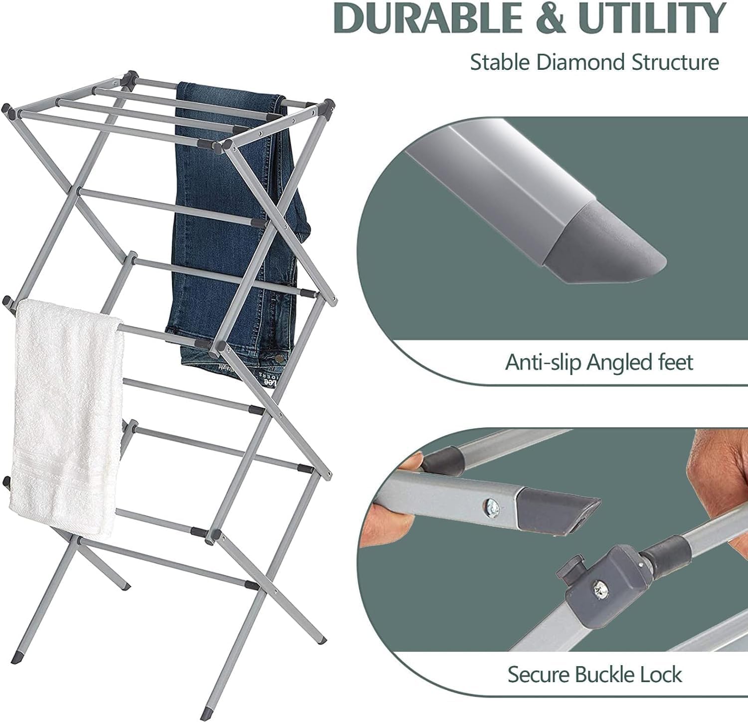 - Assembly requires no tools, easy to open and close when drying laundry; Accordion design folds flat for easy and compact storage when not in use; Can be used indoors or outdoors; The cloth drying stand will be the best choice for compact apartments without a dryer. The lightweight design makes it easy to move from room to room, indoor to outdoor.