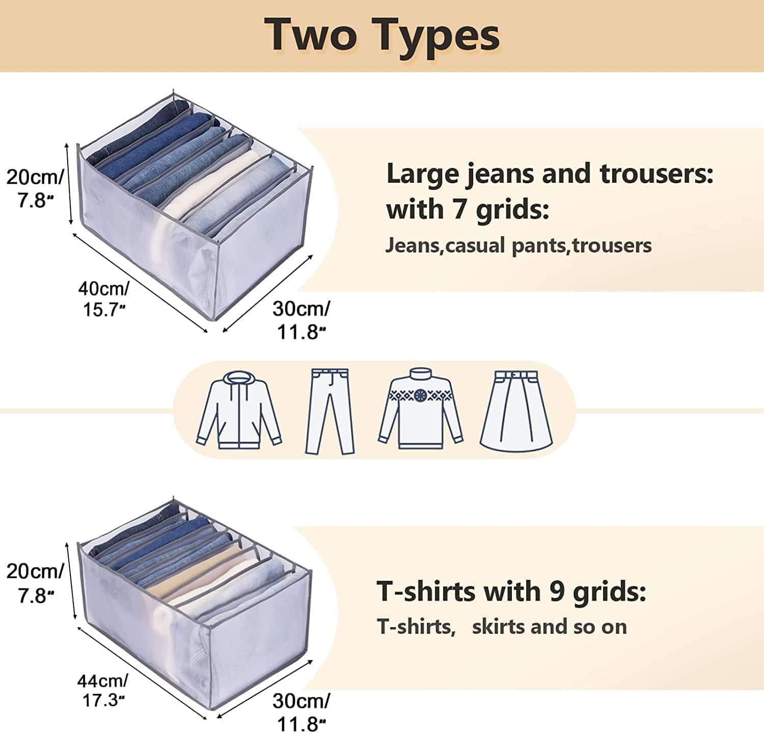 - Foldable - The jeans compartment storage box is convenient for you to locate clothes. Which is in a foldable design, saving time and space, greatly improves the utilization rate of wardrobe space.