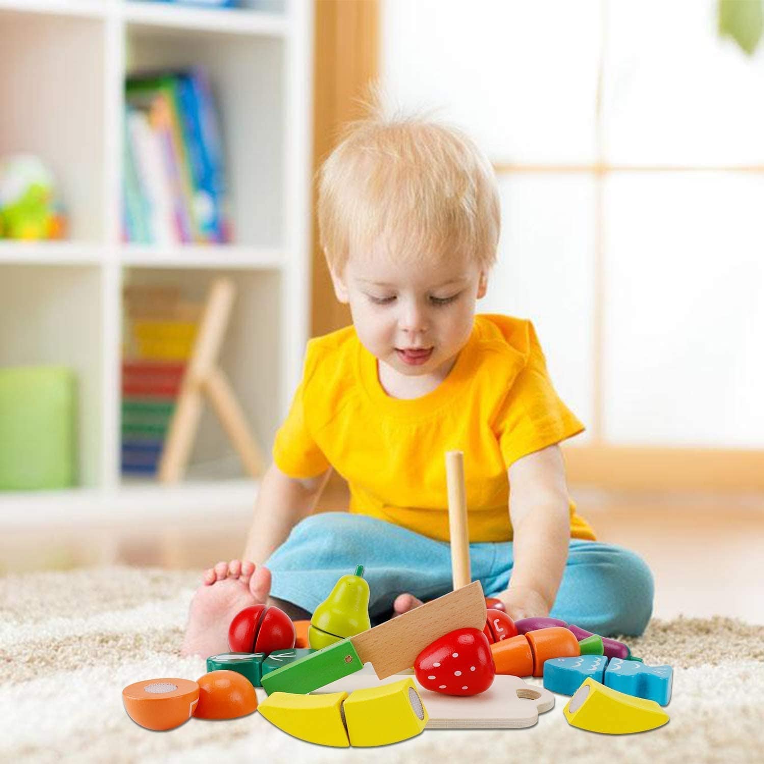 - Healthy food toys: Uses wooden cutting tools, so that your child can learn shapes, colors, names and basic types of vegetables in a fun way as early as possible.