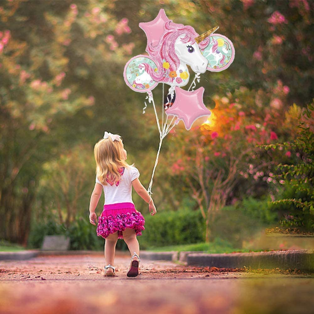 - Set includes 5 mylar balloons in total - A 27.8” large unicorn, two 18” round unicorn balloons and two pieces of 18” star foil balloons