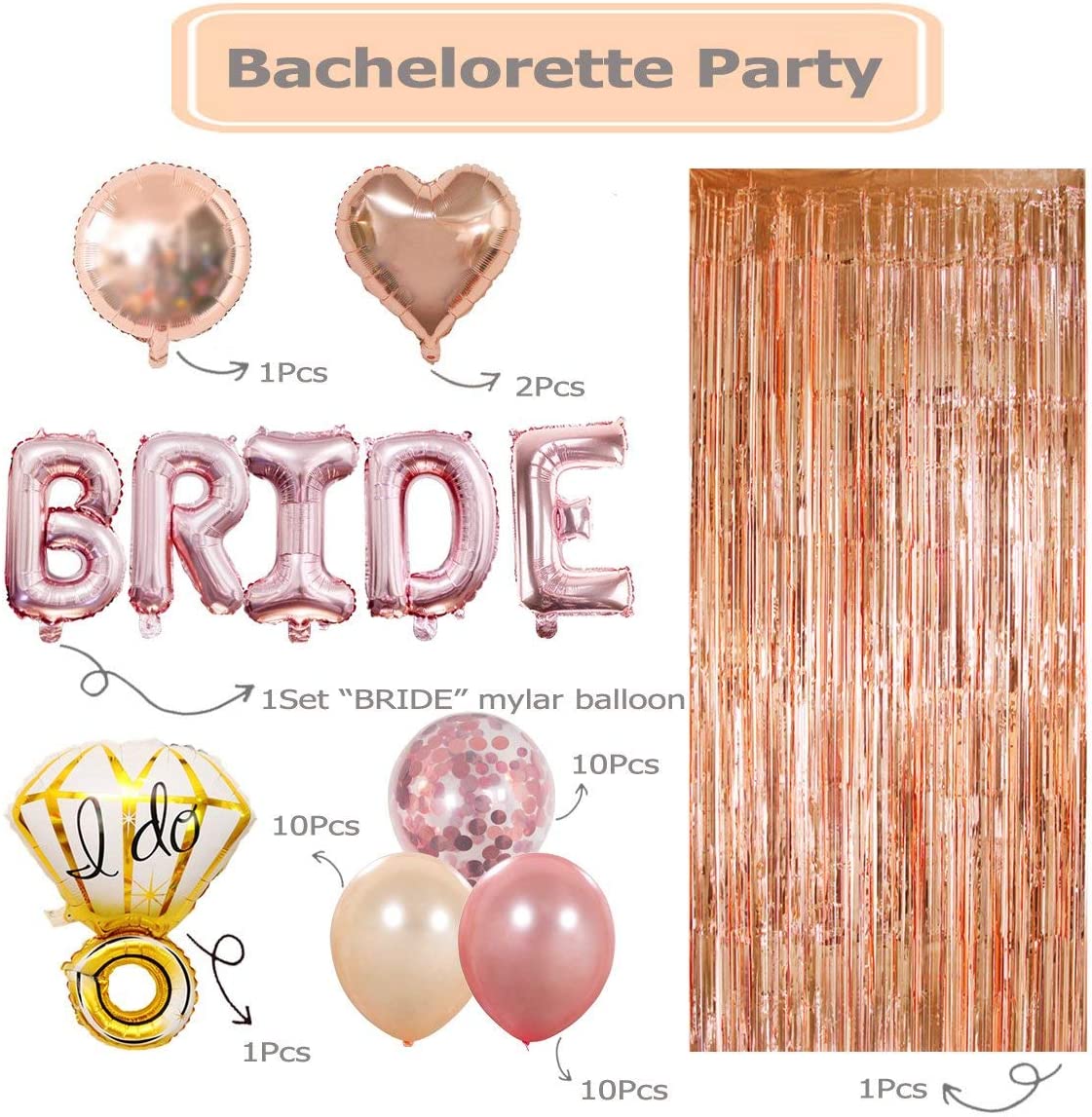 - 1 Foil Fringe Curtain, 1 set BRIDE, 1 Ring, 3 mylar balloons, 20 latex balloons and 10 confetti balloons, total 40 units, there are all Decorations Kit you want for Bride Party.