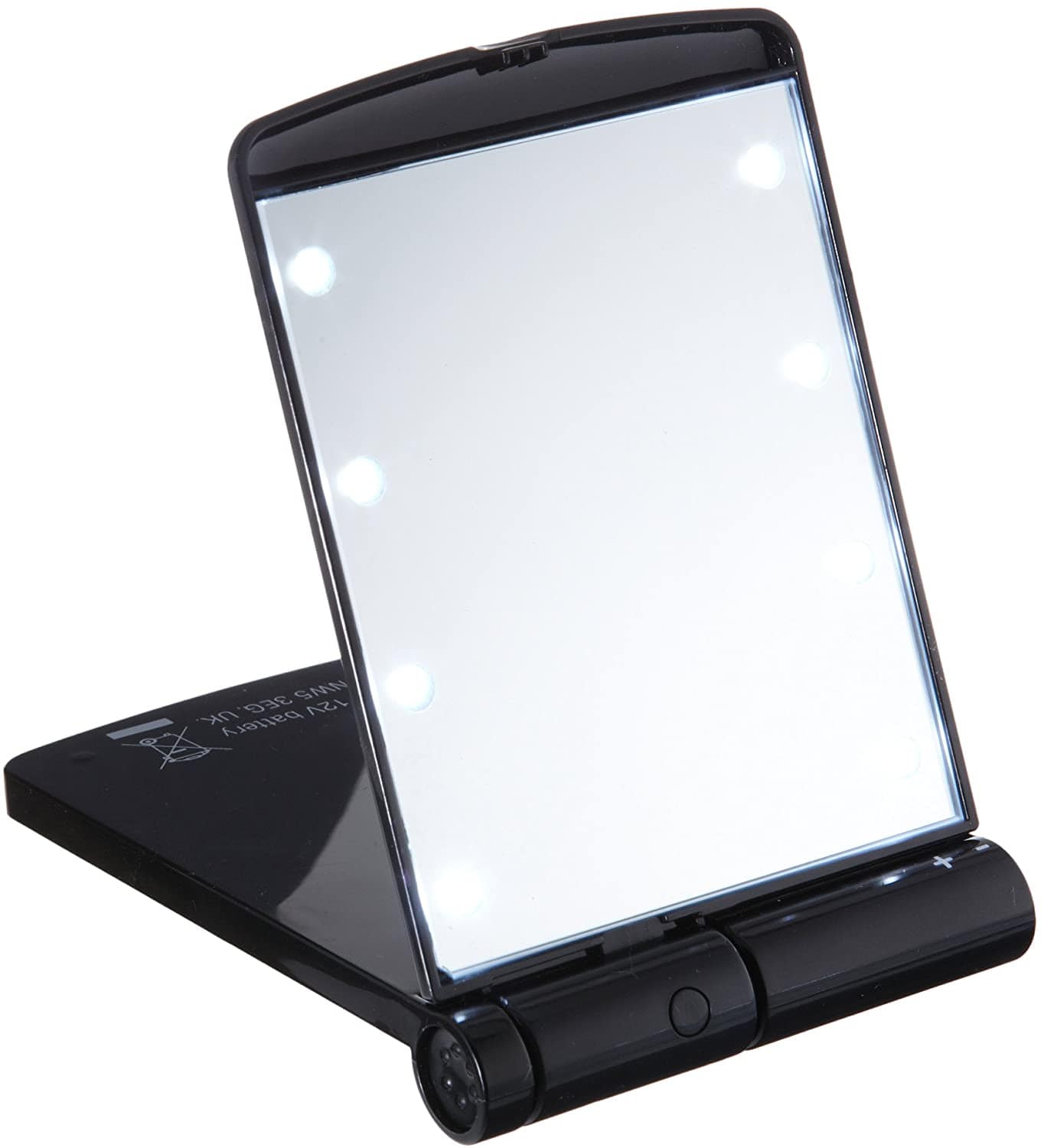 - The LED Lighted Cosmetic Make Up Mirror illuminates your entire face even in the dark using powerful 8 COB LED lights rated for 100,000 hours. The bi-fold travel makeup mirror is compact, lightweight and easily fits into your handbag or purse.