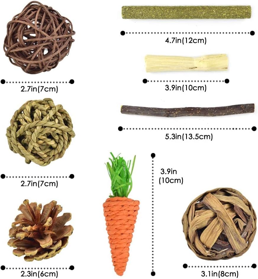 - Packing List: The gerbil toys set contains 10 small pet apple wooden chew toys: 1 Apple Wood Molar String, 1 Grass Ball Molar String, 1 Carrot, 1 Pine nut, 3 Rattan Balls, 3 Types 100g mixed (Apple Branches + Grass Sticks + Sweet Bamboos).